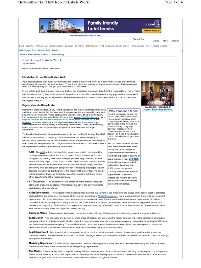 The Major Labels - Everything You Need To Know About ... - Soundplate Playlisting Brands Owned by The Major Labels. The major labels aggressively market their music to protect their market share. One tactic that has been vital to the major labels in the past few years has been playlist promotion. All of the major labels have their own Spotify playlist submission and curation strategies. Organization of a Record Label - How Record Labels Work - HowStuffWorks Record companies (known as record labels because albums have a label indicating which company produced it) take on a lion's share of the work of the music industry. They sign, develop, record, promote, publicize and sell music. Of course, all those things happen before the album ever gets into the store. How do labels work? - born.alfa145.com How do labels work in the music industry? Record labels typically set the terms and conditions of artist contracts in their favor. In the case of newly signed artists, record labels can control the type of music they record, which can include everything from the way the music sounds to the song lyrics. They also control album cover art in most ... How to Start a Record Label | TRUiC Some labels work with publicists, music promoters, booking agents and others to increase awareness and spur record sales, radio play and ticket sales to live shows. Legal services -- $500 to $1,000. You can find artist contract templates online, but you're better off enlisting professional guidance in writing at least your first contracts. ...